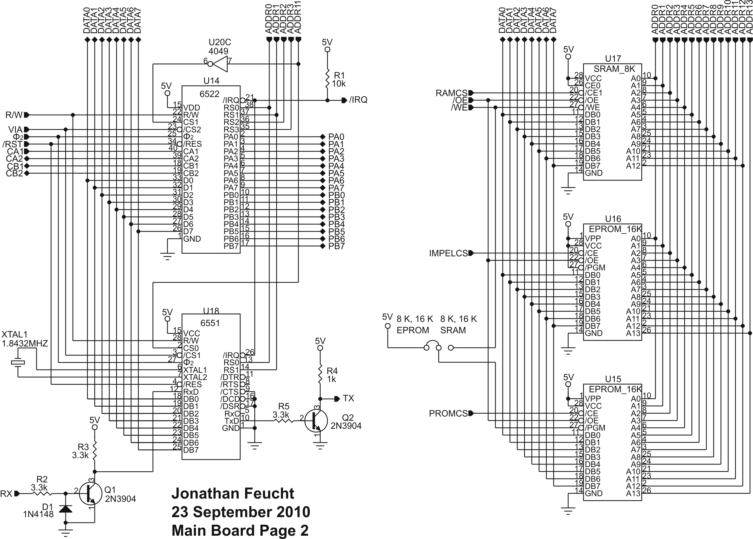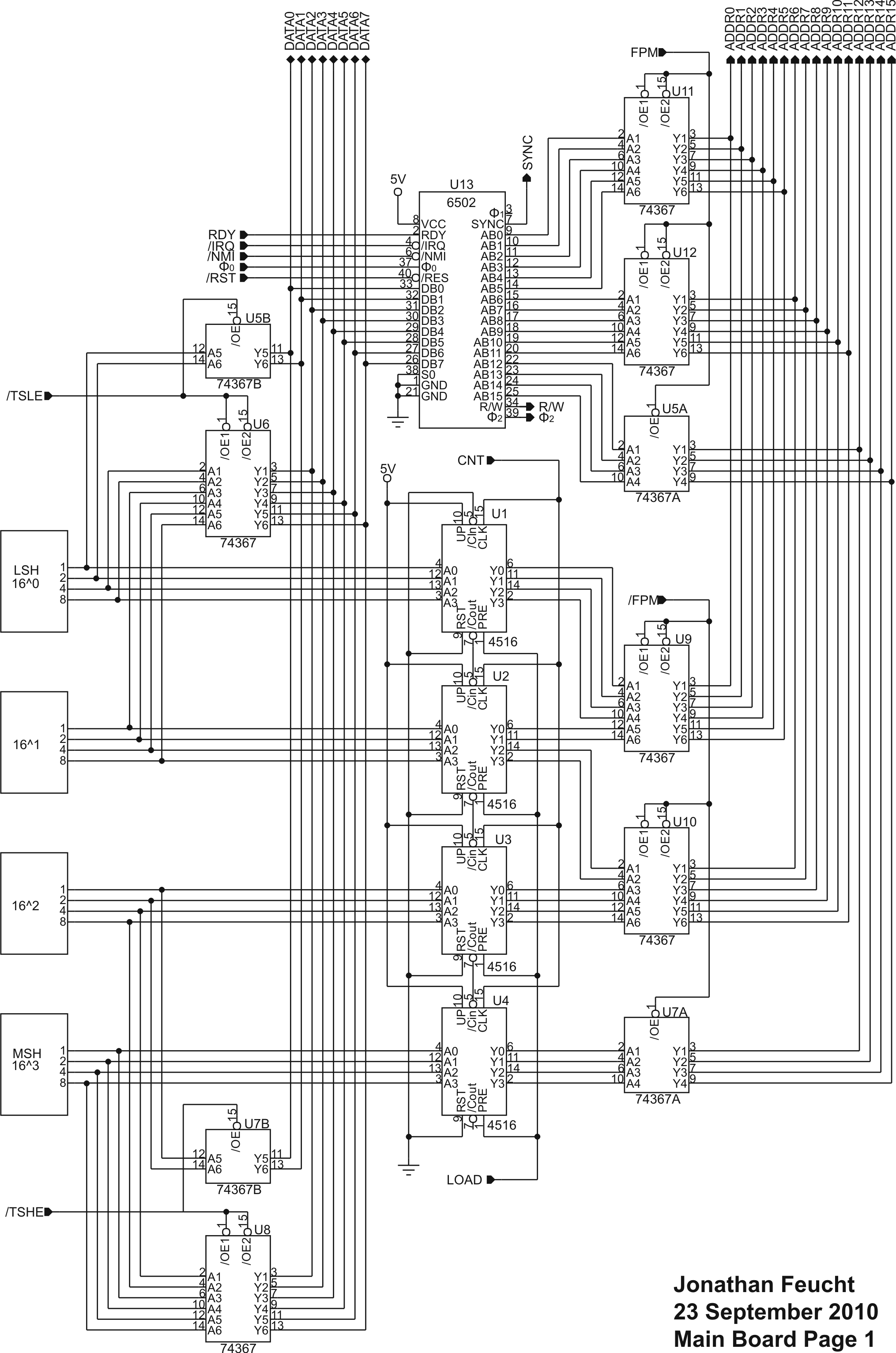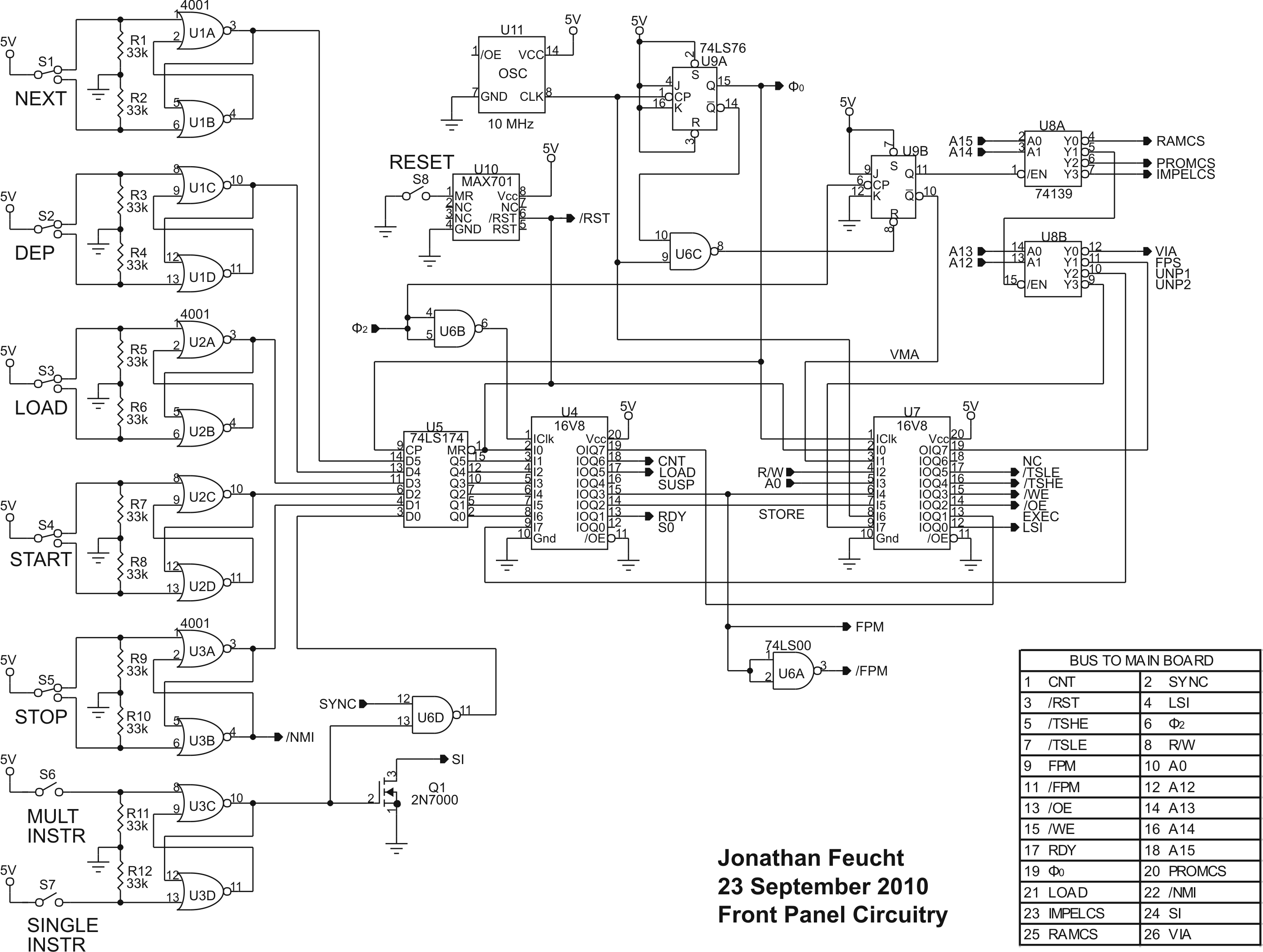 The circuitry consists of four sections: a main board, including the processor, thumb switches, and ACIA; the front panel logic board, consisting of several discreet logic chips; push buttons, for which the signals fed directly into the front panel logic board; and the display board, which consisted of a bunch of LED's which displayed the bits of the address and data busses on the main board. The wires from the push buttons fed directly into the front panel circuitry. My initial instructions were to simply get his system to work again. Although, early on, I knew it would be a bit more complicated than that, since the prototype board I was given had several disconnected wires, and I found out pretty quickly that the circuit did not match the schematic, and there were a few extra gates. I ended up reverting to the schematic, because I simply had no idea what the extra gates were used for, since some of the wires had become disconnected from the board. Also, the prototype design did not have any program or data memory chips, and did not yet have an ACIA. The project quickly turned into me redesigning the entire thing so it included memory.