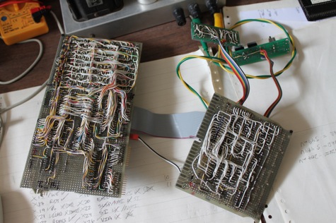A much needed improvement was to replace many of the discreet logic chips with programmable logic devices (PLD's). The discrete logic chips contain four 2-input gates or two flip-flops in a 14-pin package, but with the GAL16V8, you have access to 8 flip-flops and hundreds of gates in a 20-pin package, so you could fit a lot more circuitry in a smaller area. They probably didn't even exist when my uncle designed the project back in 1976. I still used 2-input NOR gates to debounce the pushbuttons and a hex flop to synchronize the signals, but the rest of the circuitry is programmed onto the PLD's. With the PLD's, at least I could change the circuitry without having to unsolder and solder wires. I got my uncle's Superpro/Z programmer working for the first time, and began programming chips.