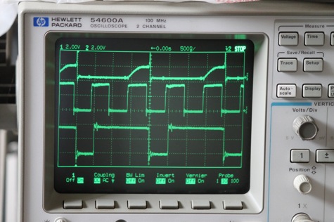 Right: Top view of front panel logic board, showing the two programmable logic devices